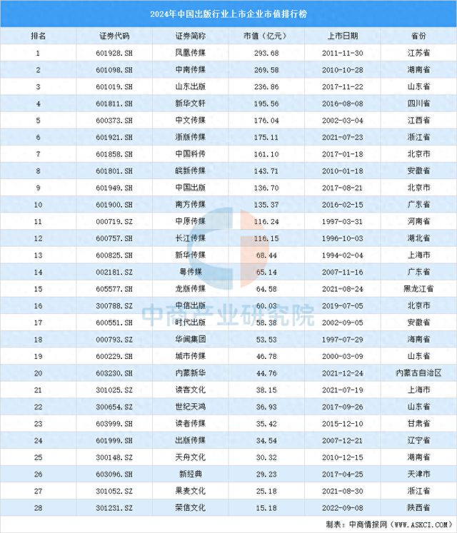 更多资料请参考中商产业研究院发布的《中国出版市场前景及投资机会研究报告》,同时中商产业研究院还提供产业大数据★★★、产业情报★、行业研究报告、行业白皮书w66利兰国际、行业地位证明、可行性研究报告、产业规划、产业链招商图谱、产业招商指引★、产业链招商考察&推介会、★★“十五五★★”规划等咨询服务。 中商情报网讯:中商产业研究院数据库显示,2024年中国出版行业市值最高的前十名企业分别是凤凰传媒w66利兰国际、中南传媒★★、山东出版★、新华文轩★★★、中文传媒、浙版传媒、中国科传★、皖新传媒、中国出版和南方传媒★。
