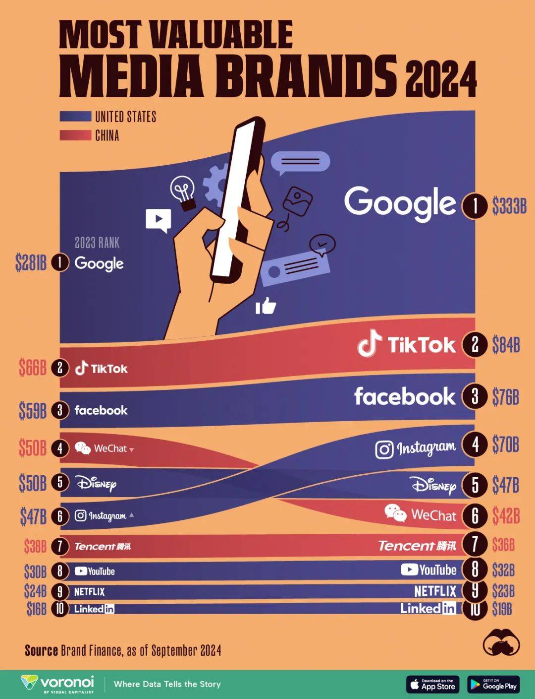 【图说】2024年全球最有价值的Top10媒体品牌:TikTok 排名第二、微信第六! |