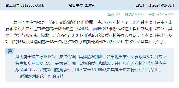 11、问:尊敬的国库司领导:请问市政道路维修维护属于特定行业业绩吗?一政府采购项目评审因素要求投标人完成过市政道路维修或改造工程业绩,而把公路维修或改造工程和新建排斥在外,具网上查询得知湖南★★★、湖北、广东多省已启用公路和市政资质业绩等互通互认,而本项目并未涉及项目的新建只是路面的维修维护以及市政设施的维修维护公路业绩和市政业绩具有相同性质★★。 答:关于具体采购项目执行问题,请结合采购项目实际情况★★,按照政府采购法及其实施条例★★、《政府采购竞争性磋商采购方式管理暂行办法》(财库〔2014〕214号)等政府采购法律制度规定执行★。