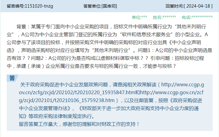 答:关于具体采购项目执行问题,请结合采购项目实际情况,按照政府采购法及其实施条例、《政府采购货物和服务招标投标管理办法》(财政部令第87号)等政府采购法律制度规定执行。 5、问:背景:某属于专门面向中小企业采购的项目★,招标文件中明确所属行业为★“其他未列明行业”★★★,A公司为中小企业主管部门登记的所属行业为“软件和信息技术服务业★★★”的小型企业★。A公司参与了该项目的投标,并按照采购文件中明确的采购标的对应行业出具《中小企业声明函》,声明函采购标的对应行业填写为★★★“其他未列明行业”★★。问题1:A公司的中小企业声明函是否有效★★★??问题2★★:A公司的行为是否构成以虚假材料谋取中标★??引申问题:招标投标过程中★★★,承建(承接)企业所属行业是否要求与标的所属行业一致,才能参与投标?