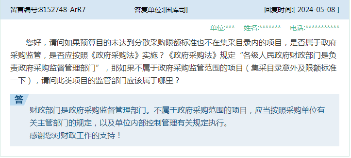 8、问:您好,请问如果预算目的未达到分散采购限额标准也不在集采目录内的项目,是否属于政府采购监管★★,是否应按照《政府采购法》实施★★?《政府采购法》规定“各级人民政府财政部门是负责政府采购监督管理部门★★★”,那如果不属于政府采购监管范围的项目(集采目录意外及限额标准一下),请问此类项目的监管部门应该属于哪里?