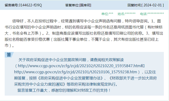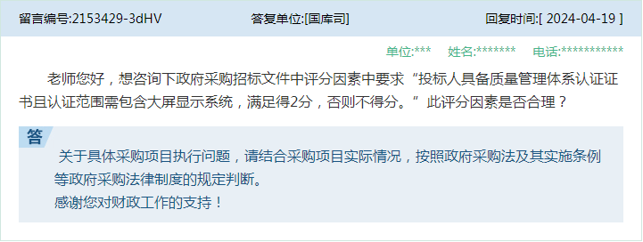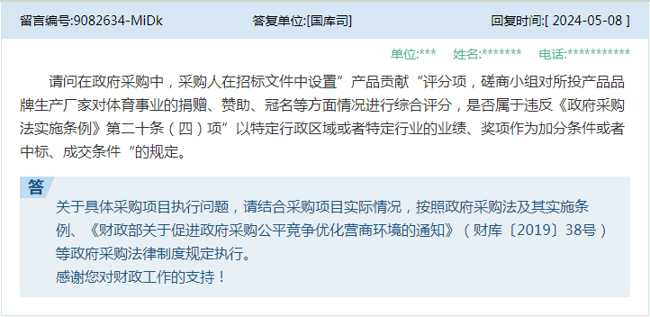 答★★:是否属于特定行业业绩,应结合项目具体情况判断,如果提出某业绩要求是从项目专业特点和实际需要出发,是为保证项目实施的质量和效果★★,并且具有该业绩的潜在供应商数量可以保证采购项目的竞争性★★★,则不宜一刀切地认定其属于特定行业业绩而禁止。 6、问:请问在政府采购中,采购人在招标文件中设置”产品贡献★★“评分项,磋商小组对所投产品品牌生产厂家对体育事业的捐赠、赞助★★、冠名等方面情况进行综合评分★★★,是否属于违反《政府采购法实施条例》第二十条(四)项★★★”以特定行政区域或者特定行业的业绩、奖项作为加分条件或者中标、成交条件“的规定★★。 14★★、问:领导好,本人在投标过程中★★,经常遇到填写中小企业声明函有问题★★,特向领导咨询。1★★★、图书行业在填写的中小企业声明函时★★,标的名称应该每一条的书名还是用纸质图书代替(有时候标大,书名会有上万条)★。2★★★、制造商是应该填写出版社名称还是填写印刷公司的名称★★★。3★★、填写出版社名称能否享受价格优惠(出版社属于事业单位,不属于企业★★★,其次有些出版社甚至已经上市)★。 15、问:老师您好★★★,想咨询下政府采购招标文件中评分因素中要求“投标人具备质量管理体系认证证书且认证范围需包含大屏显示系统,满足得2分,否则不得分。”此评分因素是否合理? 答:关于具体采购项目执行问题,请结合采购项目实际情况,按照政府采购法及其实施条例★、《财政部关于促进政府采购公平竞争优化营商环境的通知》(财库〔2019〕38号)等政府采购法律制度规定执行。 答:财政部门是政府采购监督管理部门★★★。不属于政府采购范围的项目,应当按照采购单位有关主管部门的规定,以及单位内部控制管理有关规定执行。