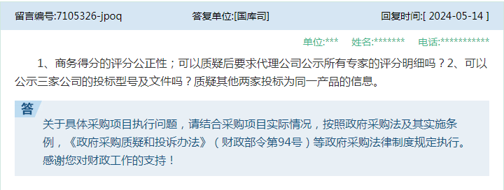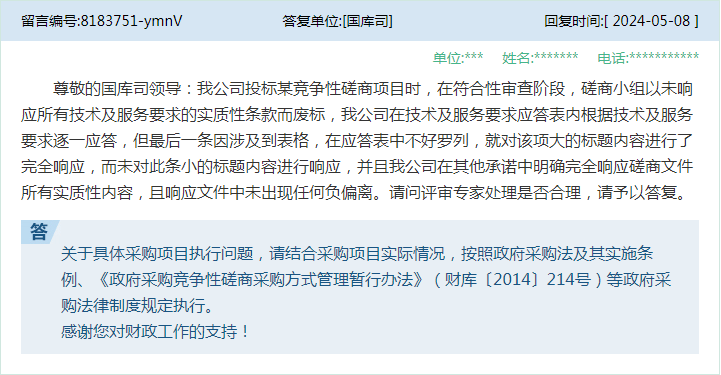 3★★★、问:1★★★、商务得分的评分公正性;可以质疑后要求代理公司公示所有专家的评分明细吗?2、可以公示三家公司的投标型号及文件吗?质疑其他两家投标为同一产品的信息。 大采购4.0白皮书 探索未来采购新蓝海★,解锁新质★“采购力★”!内附下载链接 7、问:尊敬的国库司领导:我公司投标某竞争性磋商项目时,在符合性审查阶段,磋商小组以未响应所有技术及服务要求的实质性条款而废标★,我公司在技术及服务要求应答表内根据技术及服务要求逐一应答,但最后一条因涉及到表格★,在应答表中不好罗列,就对该项大的标题内容进行了完全响应,而未对此条小的标题内容进行响应,并且我公司在其他承诺中明确完全响应磋商文件所有实质性内容,且响应文件中未出现任何负偏离。请问评审专家处理是否合理,请予以答复。 大采购4★.0白皮书 探索未来采购新蓝海★★★,解锁新质“采购力”★!内附下载链接